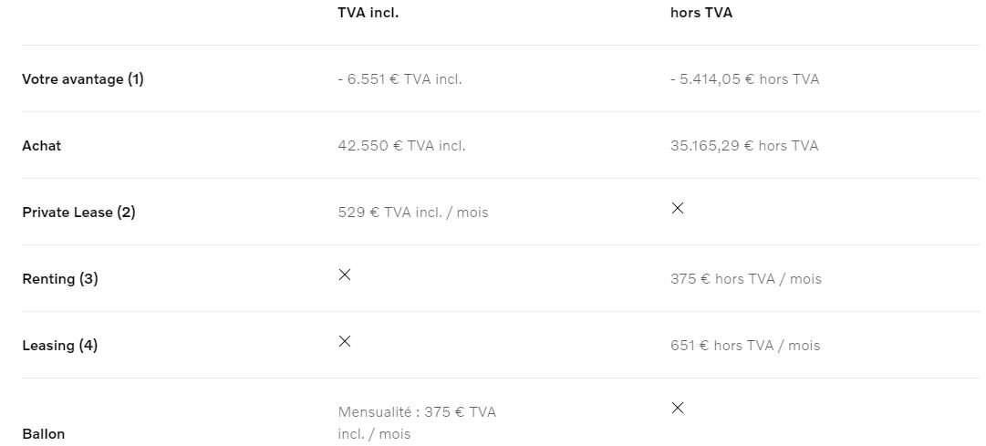 (2) Prix TVA incl., calculé sur une durée de 60 mois et 50.000 km, pour un conducteur principal âgé de 28 ans avec servicepack Drive. Private Lease est un produit de location longue durée réservé aux particuliers sans option d’achat, offert par AXUS SA, Avenue du Bourget 42 à 1130 Bruxelles (FSMA 016860 A et inscrite à la BCE n° 0403.429.730). Offre valable jusqu’au 30/11/2023 et réservée aux particuliers résidant en Belgique et sous condition d’approbation du dossier et après signature pour accord de l’offre, du contrat cadre et des conditions générales qu’il contient, du document de cession de rémunération et de la déclaration préalable à la couverture d’assurance. Le locataire ne dispose pas d’un droit de rétractation dans le cadre de ce contrat de location. Sous réserve de modification en cas de changement du prix catalogue ou des taxes.