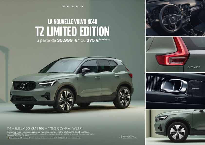 (1) Plus : Prix net/remise calculé pour la Volvo XC40 T2 (micro hybrid essence) Plus with Limited Edition, y compris tous les avantages offerts par Volvo Car Belux et ses distributeurs participant. Prix catalogue recommandé : 44.850 €. Prix TVAC. Offre valable pour les particuliers jusqu’au 29/02/2024.